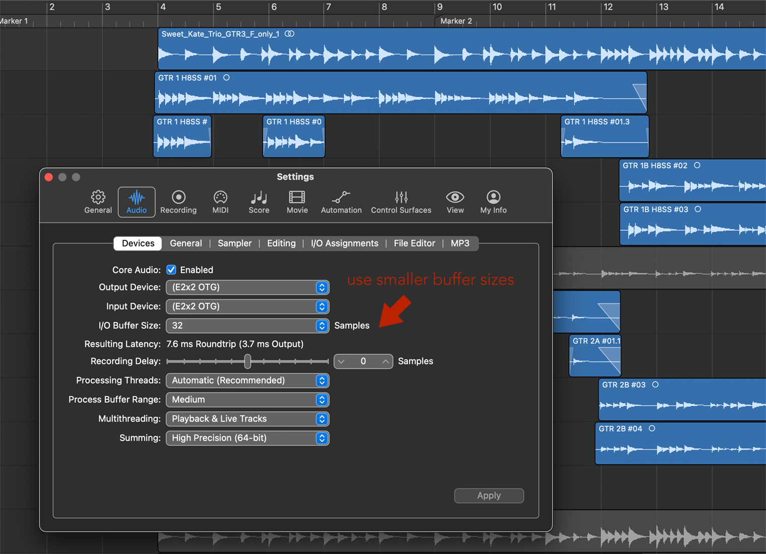 Logic Pro Settings | Set smaller I/0 buffer sizes to reduce latency.